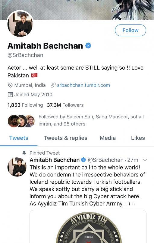 பாலிவுட்டின் பிரபல நடிகர் அமிதாப் பச்சனின் ட்விட்டர் பக்கம் ஹேக் செய்யப்பட்டு அவரது புகைப்படத்துக்குப் பதிலாக பாகிஸ்தான் பிரதமர் இம்ரான் கானின் புகைப்படம் வைக்கப்பட்டதால் பாலிவுட் திரையுலகம் சற்று அதிர்ச்சி அடைந்தது.