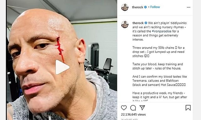 48 வயதான நடிகர் ட்வைன் ஜான்ஸன் முன்னாள் பொழுதுபோக்கு மல்யுத்த வீரர். அதில் கிடைத்த புகழின் மூலம் ஹாலிவுட்டுக்குள் நுழைந்து தற்போது முன்னணி நட்சத்திரங்களில் ஒருவராக வலம் வருகிறார். உடலைக் கச்சிதமாக வைத்திருக்க தினமும் கடுமையாக உடற்பயிற்சி செய்யும் ஜான்ஸன், சமீபத்தில் தனது இன்ஸ்டாகிராம் பக்கத்தில் காணொலி ஒன்றைப் பகிர்ந்துள்ளார். இதில் 50 பவுண்ட் எடையை வைத்து உடற்பயிற்சி செய்யும்போது முகத்தில் பட்ட ரத்த காயத்தை படம்பிடித்துக் காட்டியுள்ளார்.