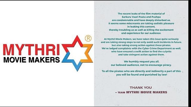 " 'சர்காரு வாரி பாட்டா' மற்றும் 'புஷ்பா' படக் காட்சிகள் கசிந்தது எங்களை வெகுவாக பாதித்துள்ளது. சில சமூக விரோதிகள் இதுபோன்ற செயல்களால் குரூர மகிழ்ச்சியைப் பெறுகின்றனர். எங்கள் ரசிகர்களின் மகிழ்ச்சியையும் இவர்கள் சிதைத்து விடுகின்றனர்.