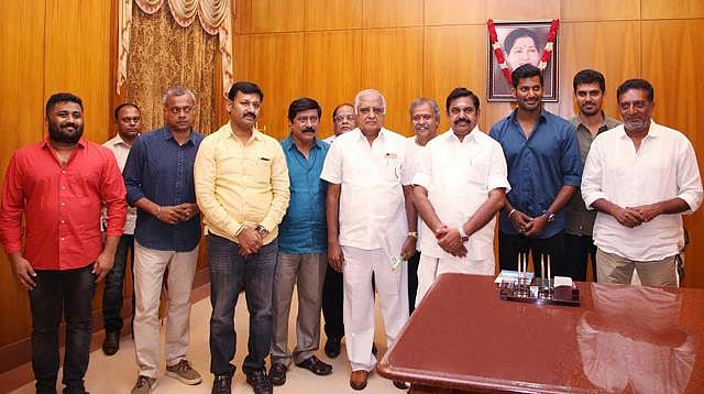 இந்நிலையில் தமிழக முதல்வர் எடப்பாடி பழனிசாமியை சந்திக்க தயாரிப்பாளர் சங்க நிர்வாகிகளுக்கு இன்று காலை நேரம் ஒதுக்கப்பட்டது. தயாரிப்பாளர் சங்க நிர்வாகிகள் விஷால், ஞானவேல்ராஜா, எஸ்.ஆர்.பிரபு, பிரகாஷ்ராஜ், கவுதம் மேனன், ஆர்.பி.உதயகுமார் உள்ளிட்ட பலர் ஒன்றிணைந்து முதல்வரை சந்தித்தார்கள்.