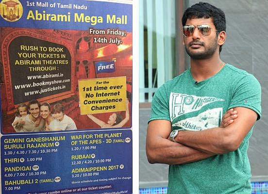 அபிராமி திரையரங்கில் இணைய டிக்கெட் முன்பதிவு கட்டணம் ரத்து செய்யப்பட்டு இருப்பதற்கு தயாரிப்பாளர் சங்கத் தலைவர் விஷால் நன்றி தெரிவித்துள்ளார்.