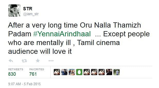 இதை 830 பேர் இதுவரை ரீட்வீட் செய்துள்ளனர். நீண்ட நாட்களாக எந்த சர்ச்சையிலும் சிக்காத சிம்பு, இந்த ட்வீட்டினால் மீண்டும் ஒரு பரபரப்பை துவக்கியுள்ளார். பிடிக்கவில்லை என்றால் எப்படி மனநலம் பாதிக்கப்பட்டவர்கள் என்று சொல்லலாம் என, தற்போது இந்த ட்வீட்டிற்கு பலர் பதிலளித்து வருகின்றனர்.