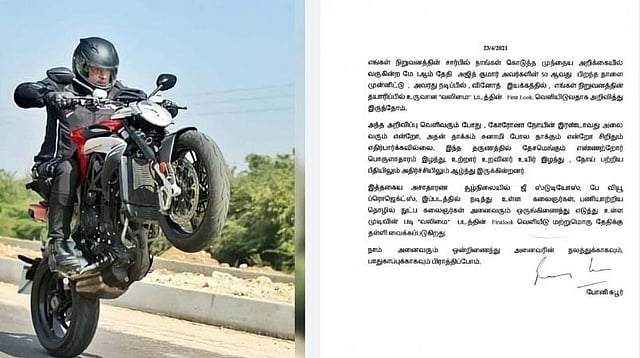 இந்நிலையில் தற்போது இந்தியாவில் கரோனா பரவல் கட்டுக்கடங்காமல் சென்று கொண்டிருப்பதால் வரும் மே 1 அன்று ‘வலிமை’ ஃபர்ஸ்ட் லுக் வெளியாகாது என்று போனி கபூர் தெரிவித்துள்ளார். இது குறித்து நேற்று (23.04.21) அவர் வெளியிட்டுள்ள அறிக்கையில் கூறப்பட்டுள்ளதாவது: