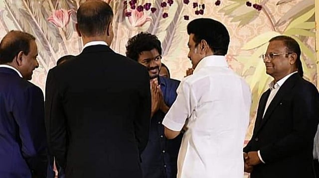 மணமக்களை வாழ்த்திவிட்டு, வெளியேறும்போது தமிழக முதல்வர் ஸ்டாலினும் திருமண விழாவில் கலந்துகொள்ள வந்தார். முதல்வர் ஸ்டாலின் வருவதை அறிந்த விஜய், அங்கேயே நின்று அவரை வரவேற்றார். ஸ்டாலினுக்கு வணக்கம் தெரிவித்து இருவரும் சில நிமிடங்களில் பேசிக்கொண்டனர்.