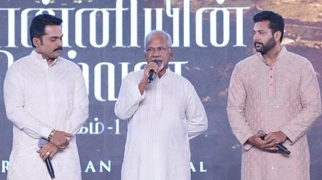விழாவில் பேசிய இயக்குநர் மணிரத்னம், "அனைவருக்கும் வணக்கம். எனது முதல் நன்றி கல்கிக்கு நான் கல்லூரி செல்ல ஆரம்பித்த போது பொன்னியின் செல்வனைப் படித்தேன். அன்றிலிருந்து அது என் மனதை விட்டு போகவில்லை. கிட்டத்தட்ட 40 வருடங்களுக்கு மேலாகிவிட்டது. இந்தப்படம் மக்கள் திலகம் எம்ஜிஆர் செய்திருக்கவேண்டிய படம். நாடோடி மன்னன் படத்திற்கு பிறகு அவர் பொன்னியின் செல்வன் படம் நடிப்பதாக இருந்தது. ஏதோ ஒரு காரணத்தால் அந்தப்படம் நின்று விட்டது. இன்றுதான் எனக்கு அந்தப் படம் ஏன் நின்றது எனப் புரிந்தது. எங்களுக்காக எம்ஜிஆர் இந்தப் படத்தை விட்டுவிட்டுச் சென்றிருக்கிறார்.