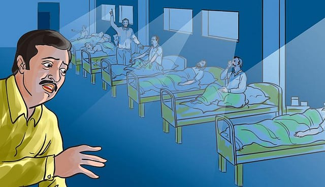 கிறீச்சிட்ட படிகள் வழியே ஏறிச் சென்றேன். வரிசையாகப் படுக்கைகள். இருட்டில் சுமார் 20 பேர் படுத்திருந்தார்கள். காலியாக இருந்த ஒரு படுக்கையில் படுத்து, நோட்டம்விட்டேன். ஓரிருவரின் கை, கால்கள் துணியால் கட்டில் கம்பியோடு கட்டப்பட்டிருந்தன. தூங்க முயற்சித்தேன். கட்டிடத்துக்கு வெளியே ‘ஊஊஊஊ....’வென ஊளை. அதே நேரம் ‘ஊஊஊஊஊ…’ என மனிதக் குரலிலும் ஊளை. பகீரென்றது. வெளியே ‘ஊஊஊ…’ என்றால் உள்ளே இன்னும் பெரியதாக ‘ஊஊஊஊஊ….’ செந்நாய்க்கும் மனிதனுக்குமான உரையாடல்போல இருந்தது அது. தெரியாமல் வந்து மாட்டிக்கொண்டோமோ?!