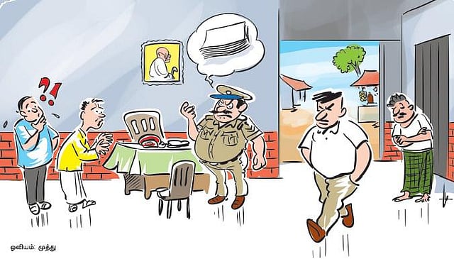 ‘ரைட்டர்’ வருவாருன்னு சொன்னாரே யாரு வருவா, ஜெயமோகனா, எஸ். ராமகிருஷ்ணனா, மனுஷ்யபுத்திரனா என்று நான் ‘ரைட்டர்’களை நினைவுகூர்ந்தேன். பம்புசெட் திருட்டு போனதை ‘ரைட்டர்கள்’ கேட்டு என்ன செய்யப்போகிறார்கள்? ஏதாவது புது கதைக்கு ‘நாட்’ தேடறாங்களோ என்றும் சந்தேகம் வந்தது. அப்போது 2 போலீஸ்காரர்கள் உள்ளே வந்தனர். ஒருவர் டீ-ஷர்ட்டும் கென்னடி கிராப்புமாக இருந்தார். “ரைட்டர் வந்துட்டாரு” என்று அந்த இளைஞன் உள்ளேயிருந்து மீண்டும் தலையை நீட்டி எங்களிடம் சொன்னார். அப்போதுதான் பள்ளிக்கூடம், போலீஸ் நிலையம் போன்றவற்றிலும் ‘ரைட்டர்கள்’ உண்டு என்பது நினைவுக்கு வந்தது. இருந்தாலும் இவர்களில் யார் ‘ரைட்டர்’ என்று மண்டையை உடைத்து யோசித்துக் கொண்டிருந்தபோது, “ஒரு குயர் பேப்பர் வாங்கிட்டு வாங்க” என்று அந்த ‘ரைட்டர்’ தன்னுடைய அவதாரத்தை வெளிப்படுத்தினார்.