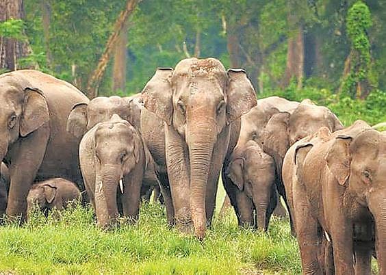 யானைக்காட்டில் உலா வரும் யானைக் கூட்டம்.