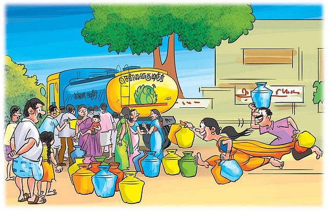 மெட்ரோ லாரியின் முன், மன்னிக்கவும் பின் வரிசையில் நிற்கும் அனுபவத்தைச் சொல்கிறேன். ஒருநாள் விட்டு ஒருநாள் மாலை எங்கள் தெருவுக்கு லாரி வருவது என்று ஏற்பாடாகிவிட்டது. முதல்நாள் கூடிய கூட்டத்தை அரசியல் கட்சிகள் பார்த்தால், குவார்ட்டர், பிரியாணி பேரத்துடன் மாநாடுகளுக்கு ஆள்பிடிக்க வந்துசேர்ந்துவிடுவார்கள்; அந்தக் கூட்டம்! பலர் தண்ணீர் கிடைக்காமல், கண்ணீராலும் வியர்வையாலும் நிரம்பிய குடங்களை எடுத்துச் செல்ல வேண்டிய நிலை. பிறகு, தண்ணீர் பிடிக்கும் நடைமுறையில் பல மாற்றங்கள் அமலுக்கு வந்தன.