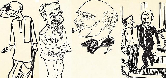1947 இந்தியா - பாகிஸ்தான் பிரிவினையின்போது, இந்து - முஸ்லிம் வகுப்பு மோதலால் ரத்த ஆறு ஓடிய நவகாளியில் அமைதிப் பயணம் மேற்கொண்ட காந்தியுடன், அவரது பேரன் துஸார் காந்தி நடத்திய ‘அமிர்த பஜார்’ என்ற பெங்காலி பத்திரிகைக்காகச் சென்றேன். காந்தியுடன் 20 நாட்கள் இருந்தேன். அப்போது நான் வரைந்த ஓவியத்தைக் காட்டி காந்தியிடம் கையெழுத்து கேட்டேன். தனது பின்பக்க உருவத்தைப் பார்த்த காந்தி, “என் முகத்தைப் பார்க்க விரும்பவில்லையா?” என்றார். நான், “உங்களுக்குப் பின்னால் இந்தியா என்ன ஆகும் என்று நினைத்து வரைந்தேன்” என்றேன். “இதற்கு என்ன தலைப்பிடுவாய்?” என்றார். “பாபுஜி எங்கே போகிறீர்கள்?” என எழுதுவேன் என்றேன். சிரித்துக்கொண்டார்.