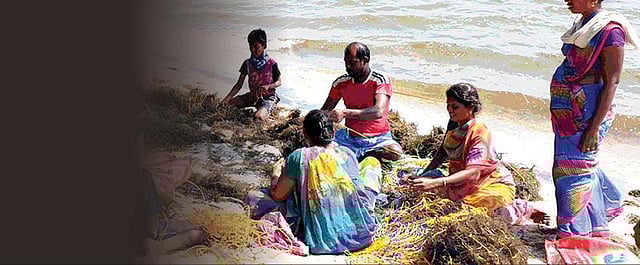 கரையில் பெண்களுக்கான கப்பா பைகஸ் அல்வரேஸி எனப்படும் கடல்பாசி வளர்ப்பு. கரைக்கடலில் கம்பு நட்டி, கயிறு கட்டி அந்தக் கயிறுகளில் விதை நாற்றைப் பிணைத்துவிடுகிறார்கள். மூழ்கி மிதக்கும் பாசிகள் வளர்ந்து, 45 நாட்களுக்குள் அறுவடைக்கான பருவமடைந்துவிடுகின்றன. பச்சையாகக் கிலோ ரூ.8-க்கு விற்கப்படும் பாசிகள் காய்ந்தால், விலை ரூ.48. அலையோட்டத்தில் பாசிகள் அறுந்து போய்விடாதா எனக் கேட்டால், இல்லை, அலையோட்டம் பாசியின் மேல் குப்பைக் கூளங்கள் சேராமல் பாதுகாக்கிறது என்று உற்சாகமாய்ச் சொல்கிறார்கள், அங்கு கழுத்தளவு நீரில் நின்றபடி அறுவடை செய்த பெண்கள்.