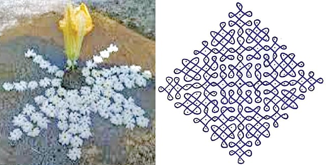 மார்கழி மாதக் கோலங்களில் ஏன் பூசணிப் பூ வைக்கும் மரபு வந்தது என்பது ஆய்வுக்குட்பட்டது. மற்ற காய்கறிகளின் பூக்கள் இருக்கும்போது, ஏன் பூசணிப் பூ வைக்கும் மரபு ஏற்பட்டது என்பது கவனிக்கத்தக்கதாகும். பூசணிப் பூ என்பது வளமையின் சின்னம். கிடைக்கும் காய்கறிகளில் பூசணியில் (வெள்ளைப் பூசணி) மட்டும் தான் அதிக நீர்ச்சத்து உள்ளது. இங்கு பூசணி என்பது பெண்ணின் வயிறாக கருது வதுண்டு.