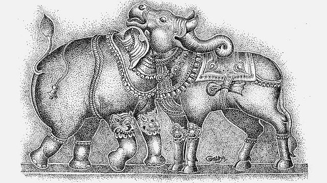 யானையும் காளையும் இணைந்த விசித்திரமான சிற்பம். இரண்டுமே உருவத்திலும் உயரத்திலும் வேறுபட்டவை. ஆனால் வலிமையில் இரண்டுமே தனிப்பட்ட திறனைக் கொண்டவை...ஒரே தலையில் இரண்டையும் இணைத்த சிற்பியின் கற்பனைத் திறனை என்னவென்று சொல்வது? இப்படி ஒரு சிற்பத்தைப் படைக்க, அவருக்கு உந்துசக்தியாக இருந்தது எது என்று பிரமிக்க வைக்கிறது.