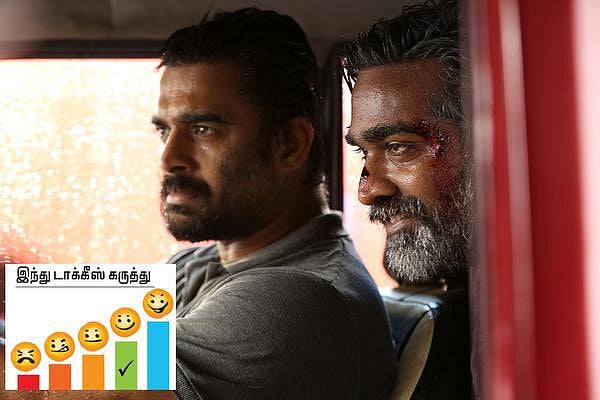 விஜய் சேதுபதியின் என்ட்ரிக்காக ஒட்டுமொத்த திரையரங்கமும் காத்துக் கிடக்கிறது. மிடுக்கான தோற்றம், கம்பீரமான நடிப்பில் மாதவன் அசத்துகிறார் என்றால் சின்னச் சின்ன உடல் அசைவிலேயே விஜய் சேதுபதி ஸ்கோர் பண்ணுகிறார். அவரது குரலும் அசட்டையான சேட்டைகளும் சுவாரசியத்தைக் கூட்டுகின்றன. வடையை கையில் வைத்துக்கொண்டு காவல் நிலையத்துக்குள் நுழையும் காட்சியில் தொடங்கி படம் நெடுக பார்ப்பவர்களை உடல்மொழியால் வசீகரிக்கிறார். உணர்வுப்பூர்வமான தருணங்களில் நெக்குருகுவது, துரோகம் உணர்ந்து பழிதீர்ப்பது என மிகவும் தேர்ந்த நடிப்பை வழங்கியிருக்கிறார். ‘சட்டைல்லாம் ரத்தக்கறை ஆகிட்டே இருக்கு. அதான் துப்பாக்கி இருந்தா டொப்னு சுட்டுடலாம்ல’ என்று நகைச்சுவையைத் தெளித்து ரசிக்க வைக்கிறார்.