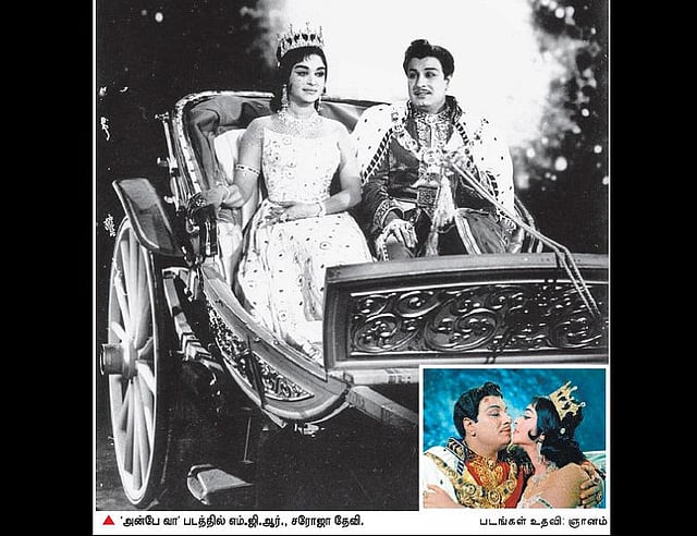 எம்.ஜி.ஆர், சரோஜாதேவி நடித்த ‘அன்பே வா’படத்தின் ‘ராஜாவின் பார்வை ராணியின் பக்கம்’ பாடல், அப்போது ஹாலிவுட் படங்களுக்கு இணையாக படம்பிடித்த பாடல். குதிரை சாரட்டில் நிஜத்தில் ஒரு ராஜா, ராணியைப் போல எம்.ஜி.ஆரும், சரோஜாதேவி இருவரும் அமர்ந்திருப்பார்கள்.