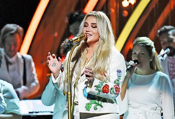 வெண்ணிற ஆடையில் பாப் பாடகி கேஷா தன்னுடைய குழுவைச் சேர்ந்த ஐந்து பெண் இசைக் கலைஞர்களுடன் ‘பிரேயிங்’ என்ற கதைப்பாடலை உருக்கமாக அரங்கேற்றினார்.