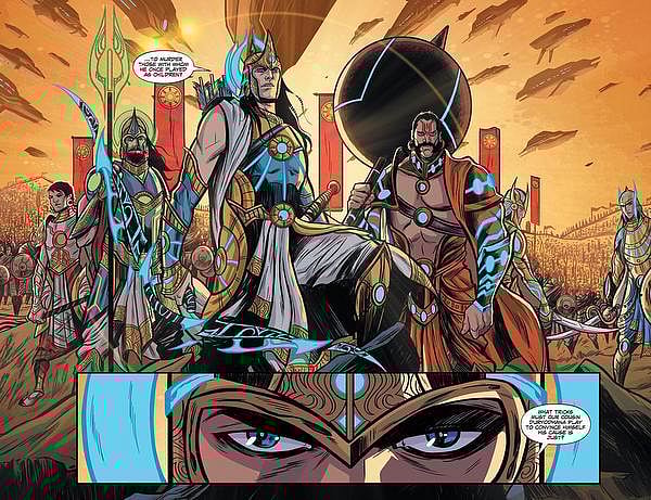 அதன் பிறகு, “தர்ம யுத்தத்துக்கு நீங்கள் தயாரா?” என்று கேள்வி மீண்டும் கேட்கப்படுகிறது. இம்முறை அர்ஜுனனிடம் யுதிஷ்டிரன் இந்தக் கேள்வியைக் கேட்கிறார். இது யுத்தத்தின் முதல் நாள். இப்படி இந்த கிராஃபிக் நாவலின் கதை கட்டத்துக்குக் கட்டம், காட்சிக்குக் காட்சி மாறிமாறிச் சொல்லப்படுகிறது.
