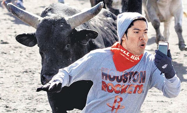 ரணகளத்திலும் இந்தப் பயலுக்கு எவ்வளவு சேட்டை பாருங்க! டெக்சாஸ் மாகாணத்தில் நடந்த காளை ஓட்டம் (bull run) போட்டியில் பங்கேற்றார் இவர். மாடு அவரை முட்டி தள்ளச் சில நானோ நொடிகள் மட்டுமே எஞ்சியிருக்கும் நிலையில் செல்ஃபி எடுத்துள்ளார். இதை வீரம் என்பதா, கிறுக்குத் தனம் என்பதா?