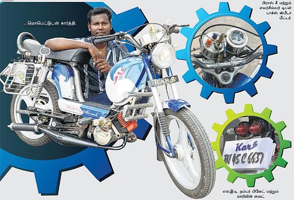 நீல நிறத்தில் பளிச்செனத் திருச்சி சாலைகளில் பறக்கும் கார்த்தியின் மொபெட்டைப் பார்க்கும் பலரும் ‘சூப்பரா ஆல்டர் செஞ்சுருக்கீங்க’எனப் பாராட்டுகின்றனர். அப்படியே எவ்வளவு செலவாச்சு எனக் கேட்கும்போது, தொகையைக் கேட்டவுடன் ஏக்கத்துடன் பெருமூச்சு விடுகின்றனர். ரூ.70 ஆயிரம் முதல் லட்ச ரூபாய் வரை செலவு செய்து புது பைக் வாங்கும் இன்றைய இளைஞர்கள் மத்தியில், பழைய வண்டிக்கு இவ்வளவு செலவு செய்து வலம் வரும் ஸ்பீடு கார்த்தி வித்தியாசமான இளைஞர்தான்.