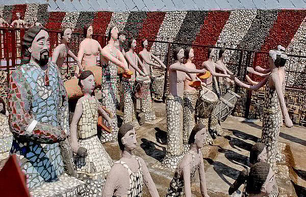 உடைந்த பீங்கான் கோப்பைகள், தட்டுகள், மின்சார உதிரி பாகங்கள், குழல் விளக்குகள், மிதி வண்டியின் பாகங்கள், பாட்டில்கள், பானைகள், குழாய்கள், கண்ணாடி வளையல்கள், மொசைக் கற்கள் என்று குப்பையில் எறியப்பட்ட பொருட்களைச் சேகரித்து, கலை நயத்துடன் உருவங்களை இங்கே படைத்திருக்கிறார்கள்.