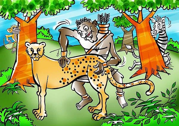 ணலும் பளபளக்கும் பாறைகளும் நிறைந்த ஹை வெல்ட் என்ற பகுதியில் சிறுத்தை, ஒட்டகச்சிவிங்கி, குதிரை என்று பல விலங்குகள் வாழ்ந்துகொண்டிருந்தன. அப்போது சிறுத்தையின் உடலில் புள்ளிகள் கிடையாது. அதன் மஞ்சள் நிறம் மணல் பரப்பு, பாறை, மரத்தின் காய்ந்த கோரைப் புற்கள், சருகுகளின் வண்ணத்துடன் ஒத்துப் போனது. அதனால் மற்ற விலங்குகளுக்குச் சிறுத்தையை எளிதில் அடையாளம் கண்டுபிடிக்க முடியவில்லை. அருகே செல்லும் விலங்குகள் மிக எளிதாக அதனிடம் சிக்கி இரையாயின. ஓர் எத்தியோப்பிய வேடரும் சிறுத்தையுடன் சேர்ந்துகொண்டு வேட்டையாடிக் கொண்டிருந்தார்.