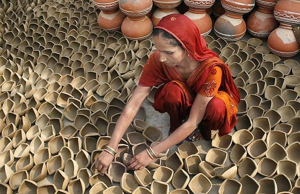 பானை செய்வதற்கான களிமண்ணை ஹரியானாவிலிருந்து கொண்டுவருகிறார்கள். மண்பாண்டங்கள் செய்வதற்கான மண்ணைத் தயார் செய்வது பெண்களின் வேலை. சக்கரங்களில் வைத்து உருவங்களைச் செய்வது ஆண்கள் வேலை.