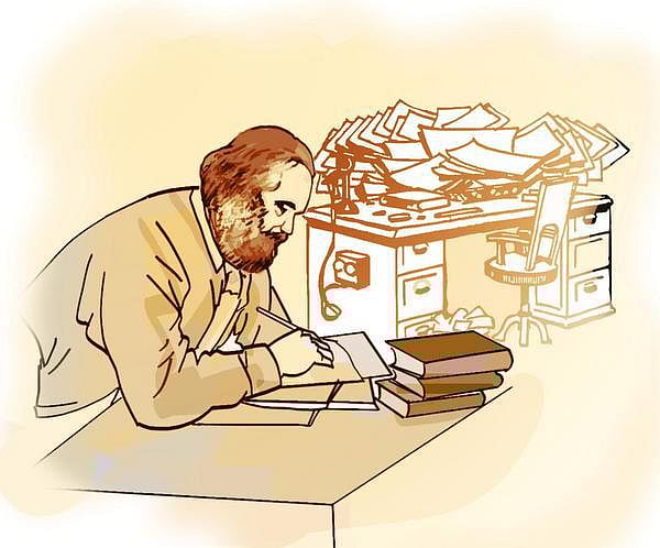 நிச்சயம் எழுதுகிறேன் என்று சொல்லிவிட்டு, மார்க்ஸ் நேராக நூலகத்துக்குச் சென்றார். சிறிது நேரத்தில் அவர் மேஜை முழுக்கப் புத்தகங்கள் நிரம்பிவிட்டன. ஒரு பக்கம் வரலாறு. பக்கத்தில் இடித்துக்கொண்டு பொருளாதாரம். ஒரு மூலையில் குண்டு குண்டாகச் சட்டப் புத்தகங்கள். இன்னொரு மூலையில் சமூகவியல். நடுவில் குன்றுபோல் அரசியல். பிறகு தத்துவம். எல்லாவற்றுக்கும் நடுவில் மங்கிய, பழைய செய்தித்தாள்கள். கை வலிக்க வலிக்க, குறிப்புகள் எடுத்துக்கொண்டார்.