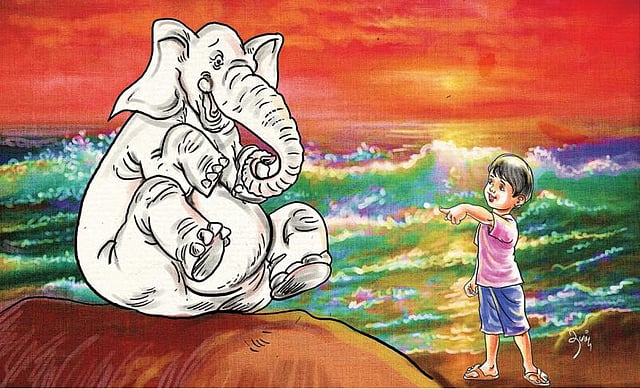 நடப்பது நிஜமா! காட்டு யானையைப் பற்றிப் படித்திருக்கிறான். கடல் யானை பற்றித் தெரியாதே. யோசனையில் ஆழ்ந்தவனை இடைமறித்தது வெள்ளை யானை.