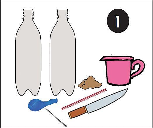 # பாட்டில்களை 10 செ.மீ. தொலைவில் வைத்துக்கொள்ளுங்கள். அந்த அளவுக்கு ஏற்ப உறிஞ்சுக்குழலை வெட்டி, பாட்டிலில் இட்ட துளைக்குள் செருகிவிடுங்கள். செருகிய இடத்தில் கெட்டியான களிமண்ணை ஒட்டிவிடுங்கள்.