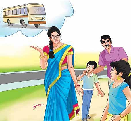 நிலா டீச்சர் குடும்பத்தினர் வெளியூரில் உள்ள உறவினர் வீட்டுக்குச் சென்றார்கள். பஸ்ஸில் கூட்டம் அதிகமாக இருந்தது. கிடைத்த இரண்டு இருக்கைகளில் அம்மாவும் அப்பாவும் உட்கார்ந்திருந்தார்கள்.