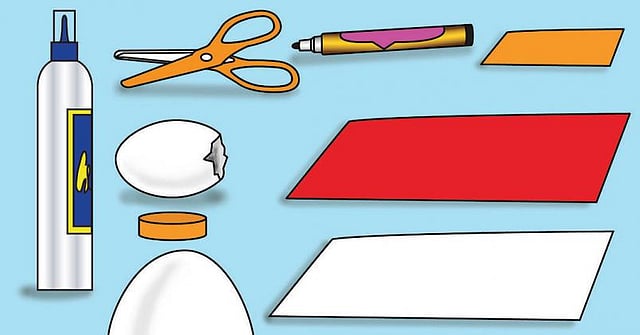 மஞ்சள், வெள்ளைக் கரு நீக்கப்பட்ட முட்டை ஓடு (நன்கு கழுவி காய்ந்தபின்), வெள்ளைப் பசை, கறுப்பு மார்க்கர் பேனா, சிவப்பு, வெள்ளை, ஆரஞ்சு வண்ண காகிதம் (கனமானது), ஆரஞ்சு வண்ணத்தில் ஒரு பிளாஸ்டிக் மூடி, கத்தரிக்கோல், பென்சில்