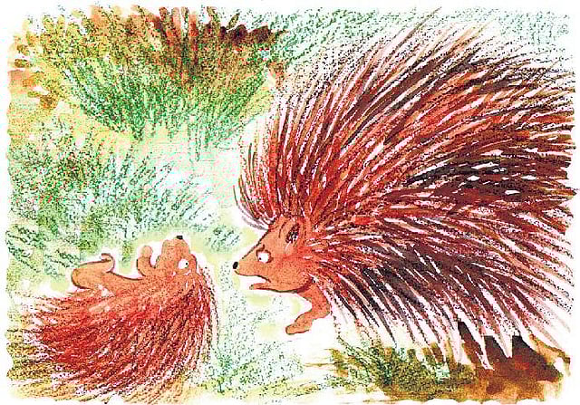 ‘மத்த விலங்குகளுக்குக் கிச்சுகிச்சு தண்டனை சரிப்படும். நமக்குச் சரிப்படாதுன்னு சொன்னேனே கேட்டியா... இப்ப பாரு... நான் கிச்சுகிச்சு செய்ததால் என் உடம்புல இருக்கிற முள் குத்தி, உன் உடம்பெல்லாம் காயமாகிடுச்சே...’ தனது குட்டியின் உடம்பைத் தடவி விட்டபடியே சோகத்துடன் கூறிக் கொண்டிருந்தது முள்ளம்பன்றி.