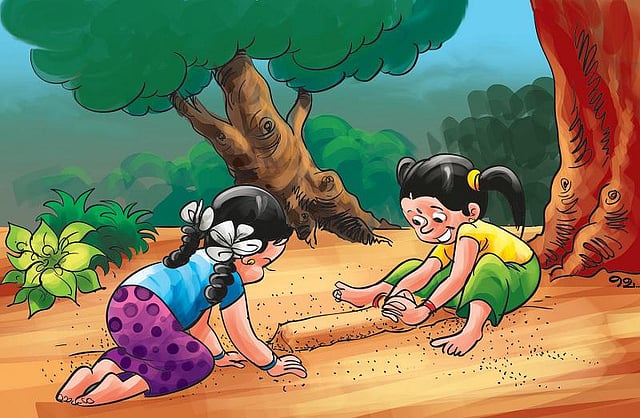 இப்போது, எதிரில் உட்கார்ந்திருக்கும் இன்னொருவர், அந்தக் குச்சி எங்கே ஒளிந்திருக்கிறது என ஊகம் செய்ய வேண்டும். வலது கை, இடது கை விரல்களை பின்னியபடி, சரியா அந்தக் குச்சி இருக்கும் மணல் குவியல் மேல கையை வைத்து மூடிக்கொள்ள வேண்டும்.
