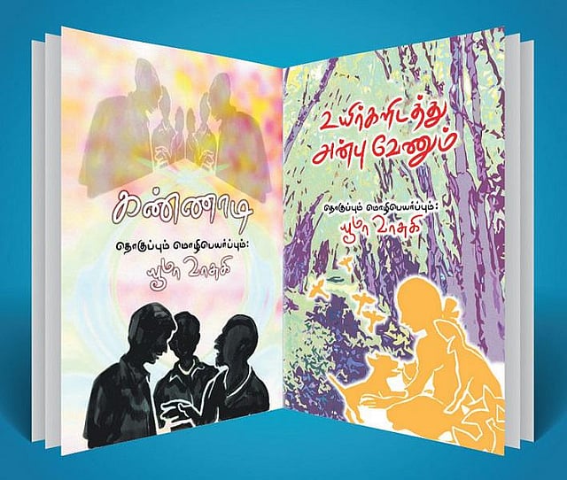 “வந்திருக்கே. இப்ப புதுசா ரெண்டு புத்தகங்களைக் குழந்தை எழுத்தாளர் யூமா வாசுகி தொகுத்திருக்கார். முதலாவது ‘உயிர்களிடத்து அன்பு வேணும்', ‘இரண்டாவது கண்ணாடி'. ரெண்டு புத்தகத்துலயும் சேர்த்து 25 குட்டிக் கதைகள். அந்தக் கதைகளைக் குழந்தைகளே வாசிச்சுப் புரிஞ்சுக்க வசதியா ஓவியர் சொக்கலிங்கத்தோட வண்ண ஓவியங்களை வரைஞ்சிருக்காரு. ஒரு பக்கத்துல பாதி ஓவியம், பாதி கதை. ஓவியமே கதையோட்டத்தைக் காட்சிகளா நம்மகிட்ட சொல்லிடுது.”