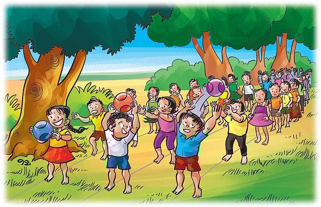 மூன்று குழுவிலும் முதலில் நிற்பவர் கையில் சற்றே பெரிய பந்து ஒன்றை வைத்துக்கொள்ளுங்கள்.