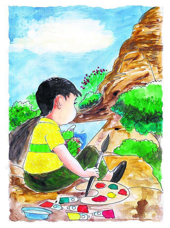 ஆதித்யா நன்றாக ஓவியம் வரைவான். ஒரு நாள் சூரிய உதயத்தைக் கண்டான். உடனே அதை வரைந்தான். அதில் அடர்ந்த மரங்களுக்கும் செடி கொடிகளுக்கும் பச்சை வண்ணம் பூசினான். பூத்துக் குலுங்கும் மலர்களுக்கும் கனிகளுக்கும் மஞ்சள் நிறத்தைத் தந்தான். ஆகாயத்தையும் பரந்த நீர்ப்பரப்பையும் நீல வண்ணத்தில் அமைத்தான். இருளான பகுதிகளுக்கும் பறவைகளுக்கும் கறுப்பு நிறம் கொடுத்தான். மலை முகடுகளிடையே காட்சி தரும் சூரியனுக்குச் சிவப்பு வண்ணமிட்டான்.