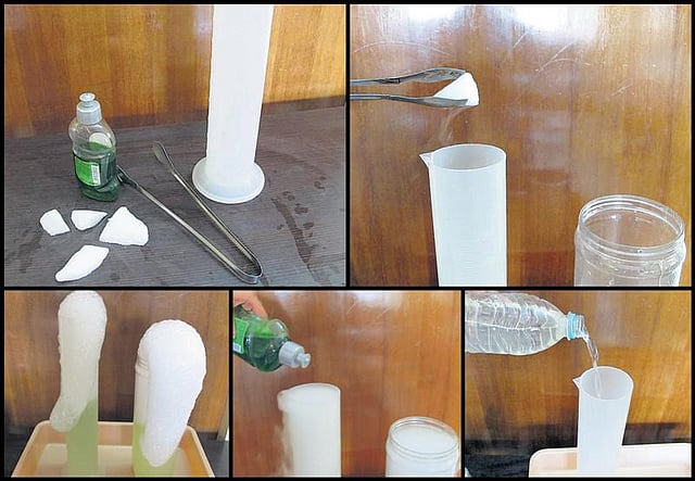 உலர் பனிக்கட்டி, உயரமான ஜாடிகள் அல்லது பாட்டில்கள், பாத்திரம் கழுவப் பயன்படும் திரவச் சோப்பு, தண்ணீர், இடுக்கி.