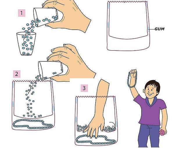 4. மேஜிக் பாருங்கள்... மாயம் இல்லை; மந்திரம் இல்லை என்று சொல்லியபடி பையின் உள்ளே கையை விடுங்கள். சிறிய பையின் அடிப்பாகத்தைப் படத்தில் காட்டியபடி விரல்களால் கிழியுங்கள். உள்ளே ஏற்கெனவே இருக்கும் முழுமையான கோர்த்த மணிமாலையை எடுத்து உயர்த்திக் காட்டுங்கள்.
