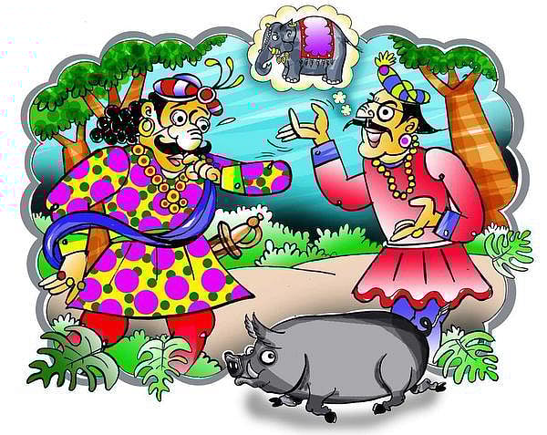 (அடுத்த மாதம் ராஜாவும் மந்திரியும் மகிழ்ச்சியாக நகர்வலம் சென்றுகொண்டிருந்தனர். அப்போது ஒரு பன்றி ஓடியது.)