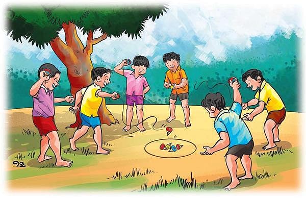 டைக்கால விளையாட்டுகளில் ஒன்று ‘பம்பரம் விடுதல்.’ 10 வயதுக்கு மேற்பட்ட குழந்தைகள்தான் விளையாட வேண்டும். பம்பரத்தில் ஆணி இருப்பதால் கவனமாக இருக்க வேண்டும். 8 பேர் வரை விளையாடலாம்.