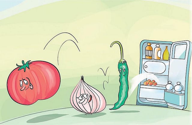 குளிர்சாதனப் பெட்டியில் வெங்காயம், பச்சை மிளகாய், தக்காளி மூன்றும் ஜாலியாக அரட்டை அடித்துக்கொண்டிருந்தன.