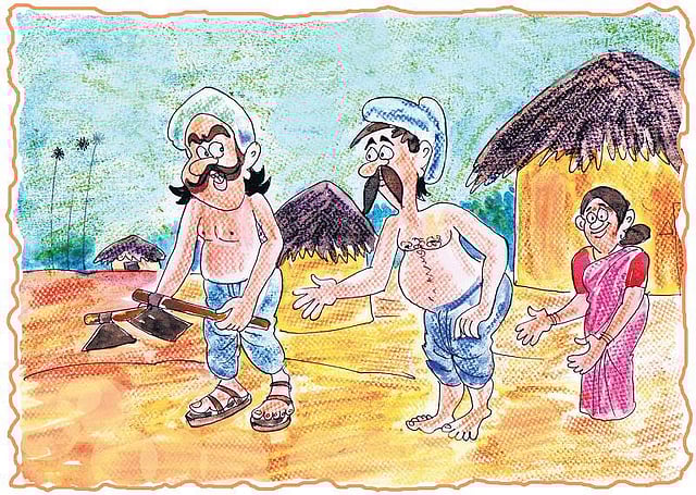 “ஏம்பா, மாடசாமி. என்னோட நிலத்தில தண்ணீ ரொம்பிக் கிடக்கு. வரப்பில இருந்த மரமெல்லாம் வேற விழுந்து போச்சு. கொஞ்சம் மண்வெட்டியும், கோடாரியும் கொடேன். சாயந்தரமா திருப்பித் தந்துடுறேன்…!”என்று கேட்டான் குப்புசாமி.