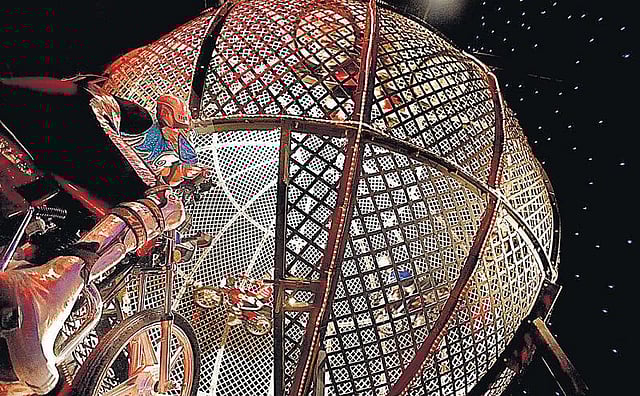 பலூனை இரும்புக்கூண்டாகவும் நட்டை மோட்டார் சைக்கிளாகவும் கற்பனை செய்து கொள்ளுங்கள். நட்டு பலூனுக்குள் வட்டப் பாதையில் கீழே விழாமல் சுழல்வதைப் போலத்தான் சர்க்கஸிலும் நடைபெறும். கூண்டு சாகச நிகழ்ச்சியில் மோட்டார் சைக்கிள் வீரர்களும் கீழே விழாமல் கிடைத் தளத்திலும் செங்குத்துத் தளத்திலும் சுழல்கிறார்கள்.