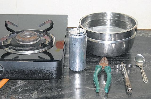 காலி குளிர்பான டப்பா (மண்ணெண்ணெய், டீசல், பெட்ரோல் பயன்படுத்திய டப்பா கூடாது), இடுக்கி, ஒரு பாத்திரத்தில் தண்ணீர், அடுப்பு.