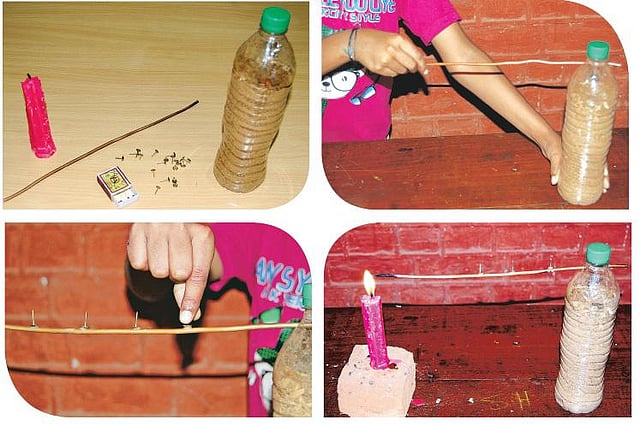 5. உலோகக் கம்பியின் வெளியே நீட்டிக் கொண்டிருக்கும் முனையில் எரியும் மெழுகுவர்த்தியைப் பற்ற வையுங்கள். இப்போது என்ன நடக்கிறது என்று கவனியுங்கள். சூடுபடுத்தும் முனையிலிருந்து ஒவ்வொரு குத்தூசியாகக் கீழே விழுவதைப் பார்க்கலாம்.
