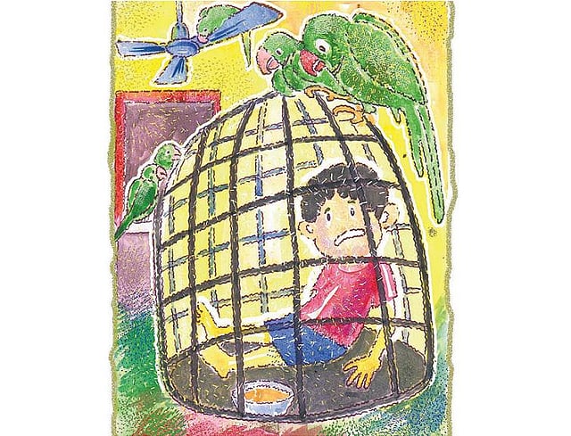 அவன் அம்மாவையும் அப்பாவையும் கத்திக் கூப்பிட்டான். கூண்டைத் திறக்க முயன்றான். எதுவும் நடக்கவில்லை. வயிறு பசித்தது. அவனுக்குப் பிடித்த நெய்ச் சோறு அருகில் இருந்தாலும் சாப்பிடப் பிடிக்கவில்லை. பள்ளிக்கூடம் போக வேண்டிய நேரமாகிவிட்டது. அவன் ஒரு நாள்கூடப் பள்ளிக்கூடத்துக்குப் போகாமல் இருந்ததில்லை.