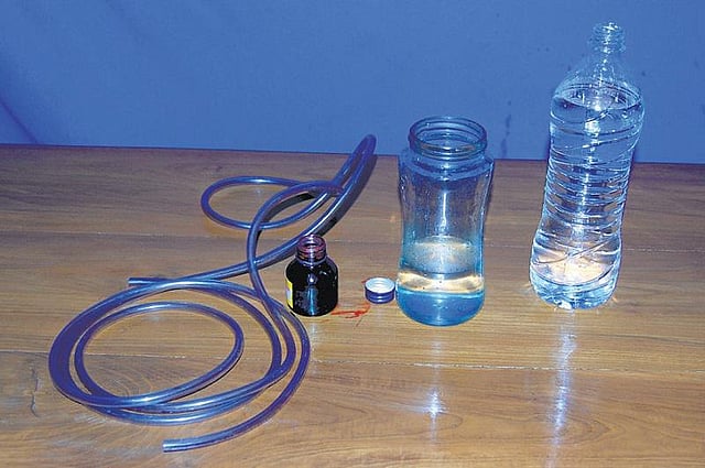 5. 1.5 மீட்டர் நீளம் கொண்ட பிளாஸ்டிக் குழாயின் ஒரு முனையைத் தரையில் உள்ள கண்ணாடி பாட்டிலுக்குள் வையுங்கள். மற்றொரு முனையை வாயில் வைத்துக் காற்றை உறிஞ்சுங்கள். உறிஞ்சுவதை நிறுத்தியவுடன் நீர் கீழிறங்கிவிடுகிறது. ஆனால், மூச்சை இழுத்து விட்டுவிட்டு உறிஞ்சினால் நீர் மேலே ஏறி வாய்க்குள் வந்துவிடுகிறது.