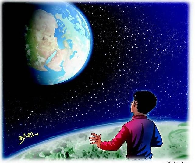 “அம்மா, நாம் இங்கிருந்து நிலாவை அண்ணாந்துப் பார்க்கிறோம். நிலவிலிருந்து பூமியை எப்படிப் பார்க்க வேண்டும்?”என நிலா டீச்சரிடம் கேட்டான்.