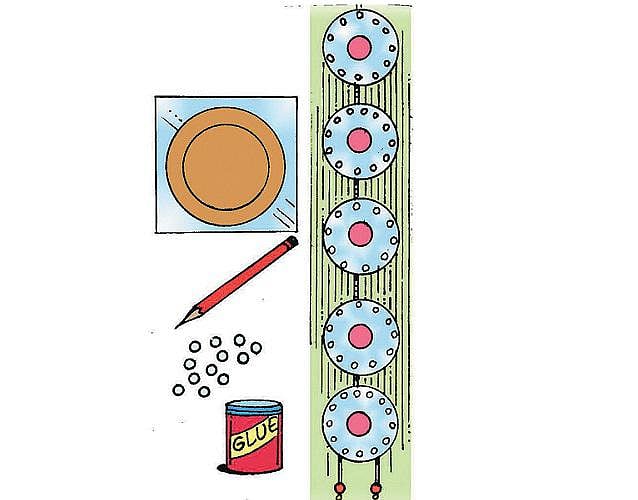 4. இப்போது அனைத்துக் காகிதத் தட்டுகளின் மேல் முனையிலும் சிறிய துளையிட்டு நூல் மூலம் அனைத்தையும் ஒன்று சேர்த்துக்கொள்ளுங்கள்.