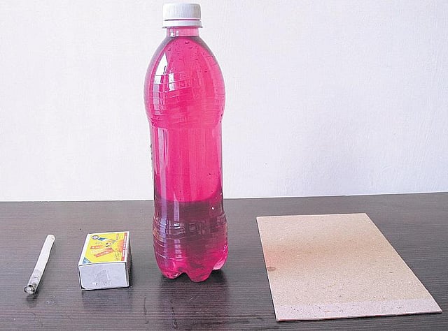 நோட்டுப் புத்தக அட்டை, பாட்டில், தண்ணீர், மெழுகுவர்த்தி, தீப்பெட்டி, பொட்டாசியம் பெர்மாங்கனேட்.